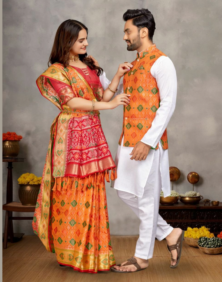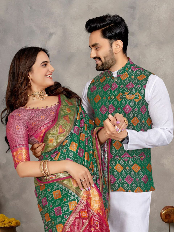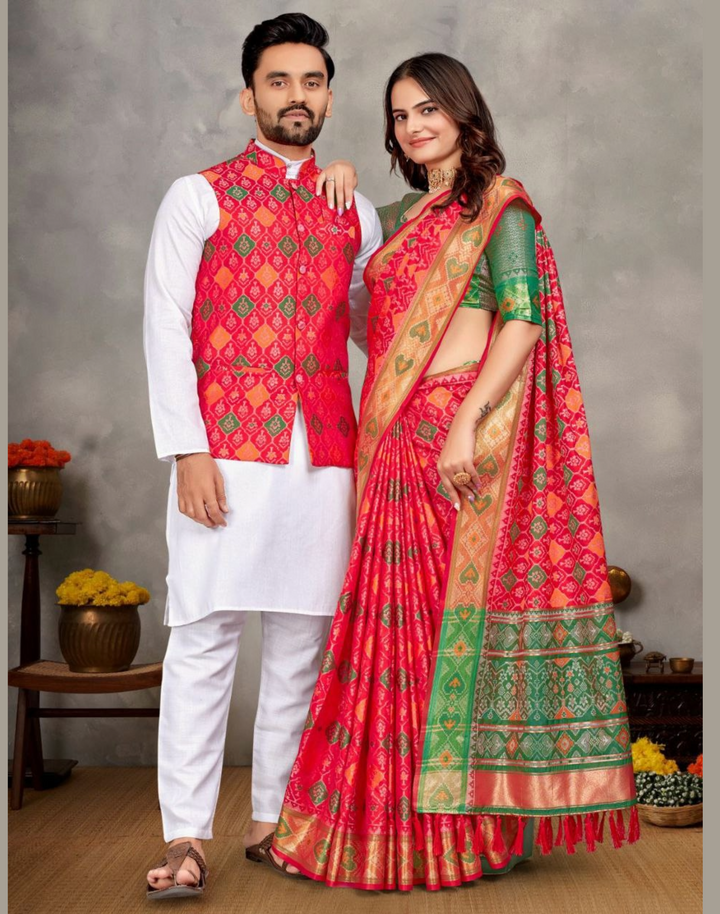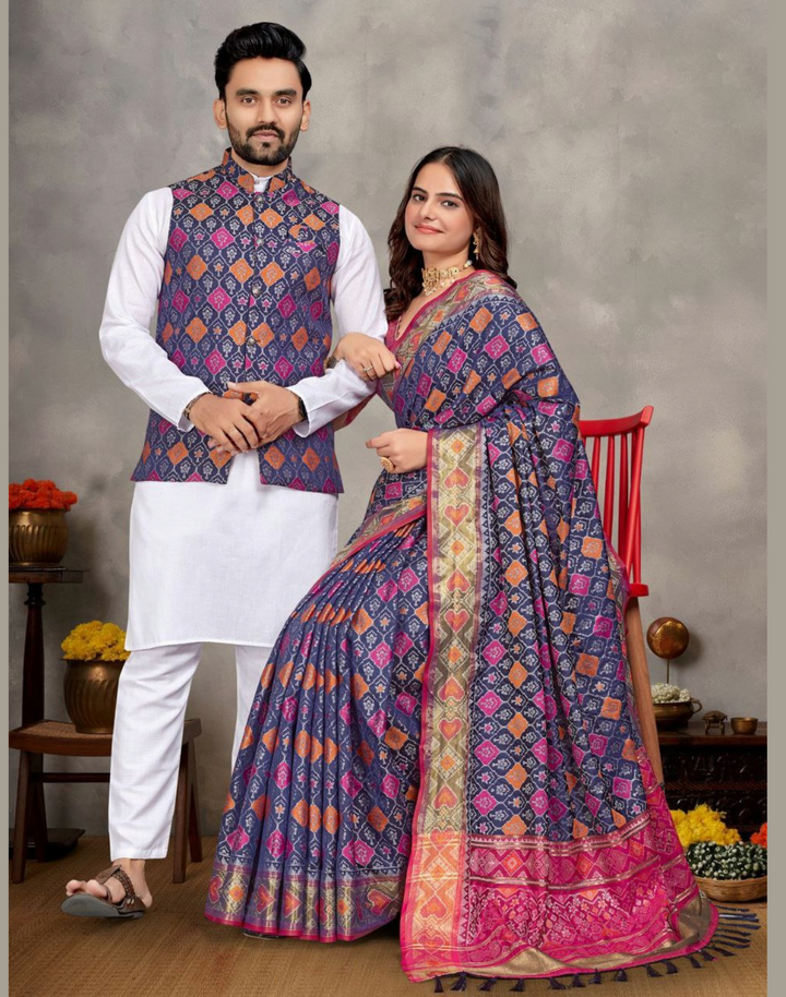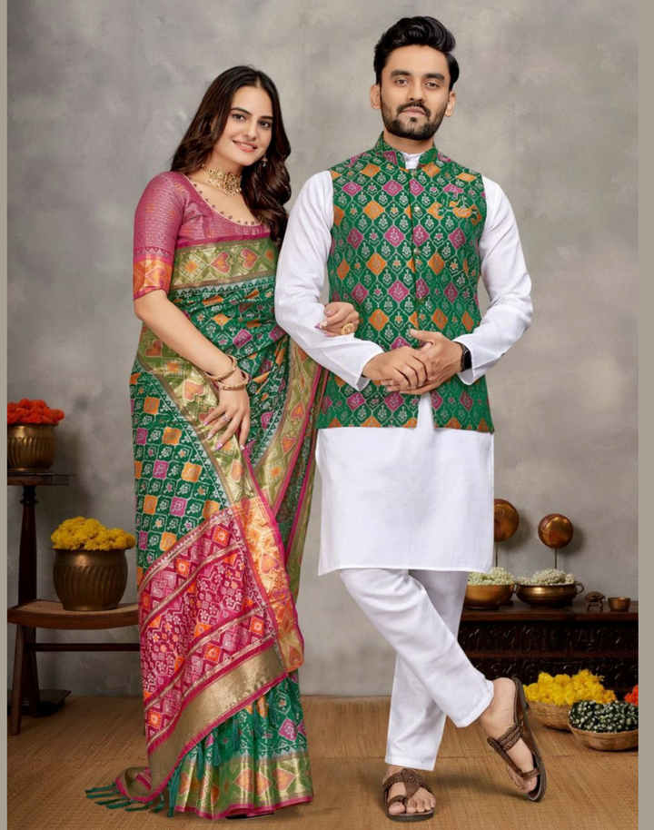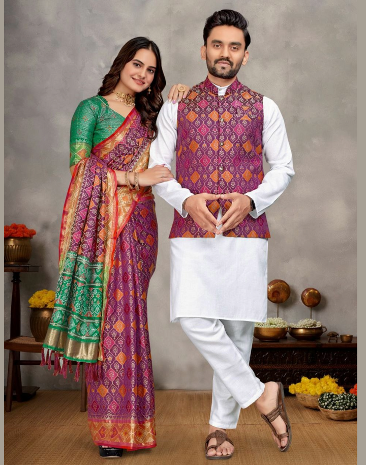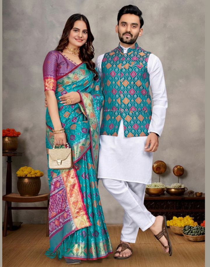 Weaving Silk Men's Kurta Pajama Koti Women Saree couple combo