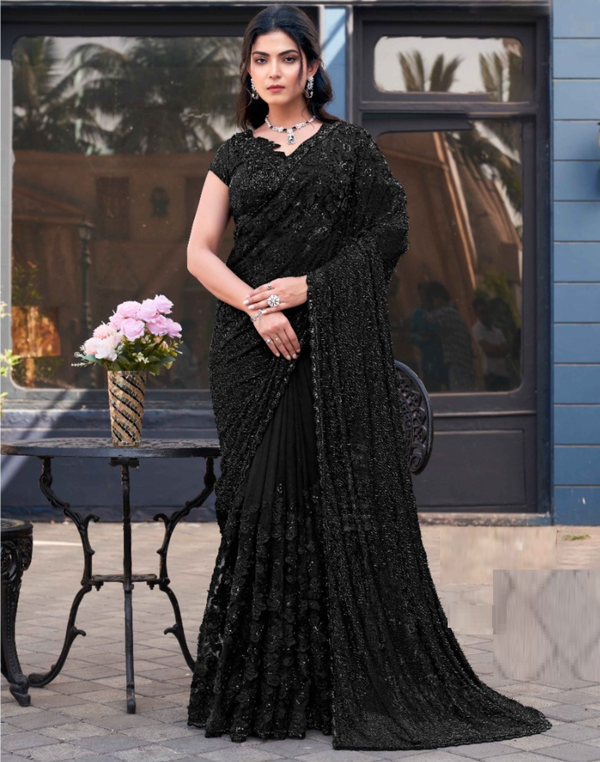 Exquisite Black color embroidered sari with blouse, a true masterpiece for any occasion. Crafted with utmost precision, this baby pink designer sequin styled georgette saree is adorned with intricate thread...
