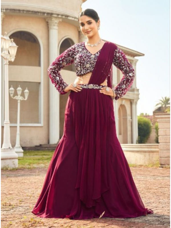 Pre-Draped Party Wear Saree with Sequin and Stone Detailing
