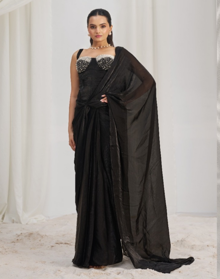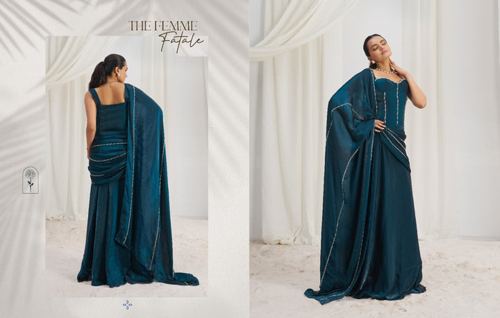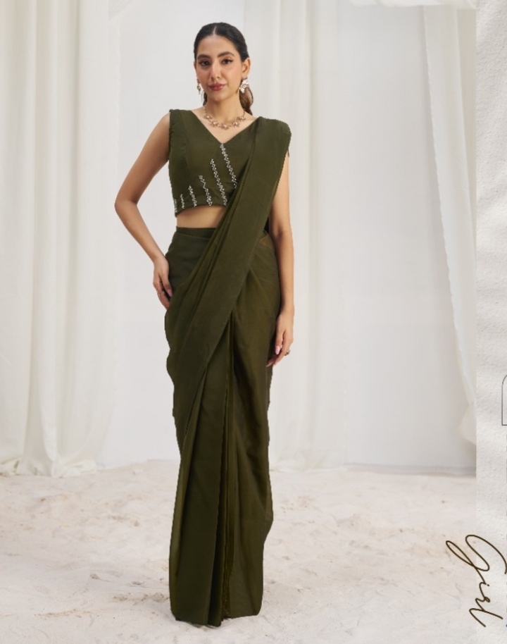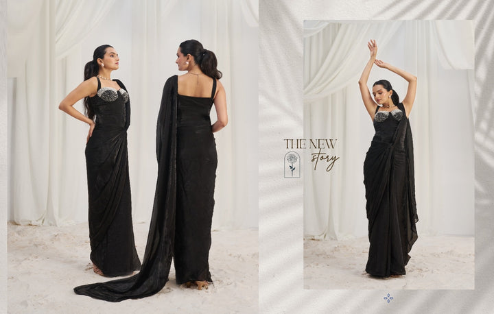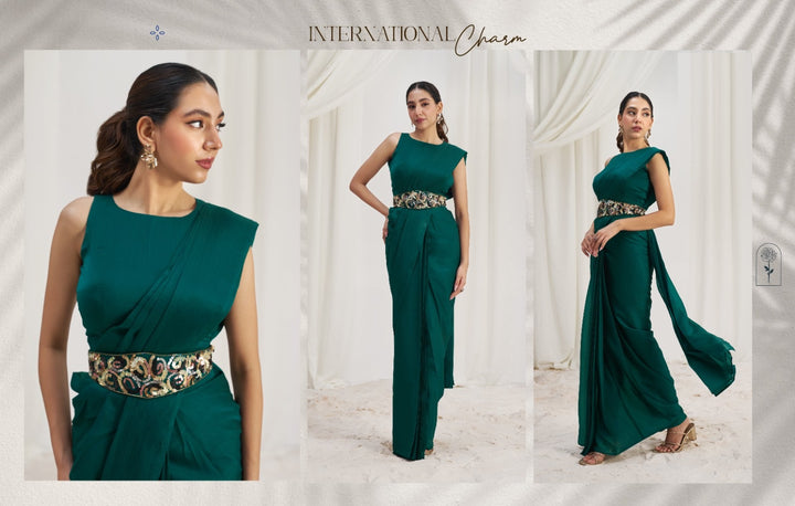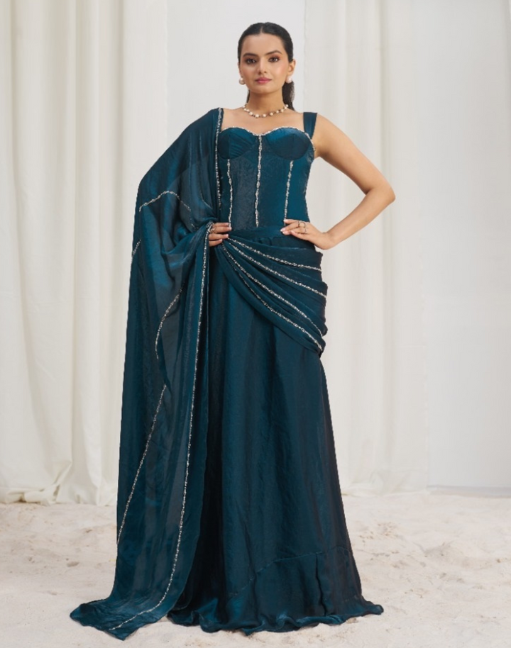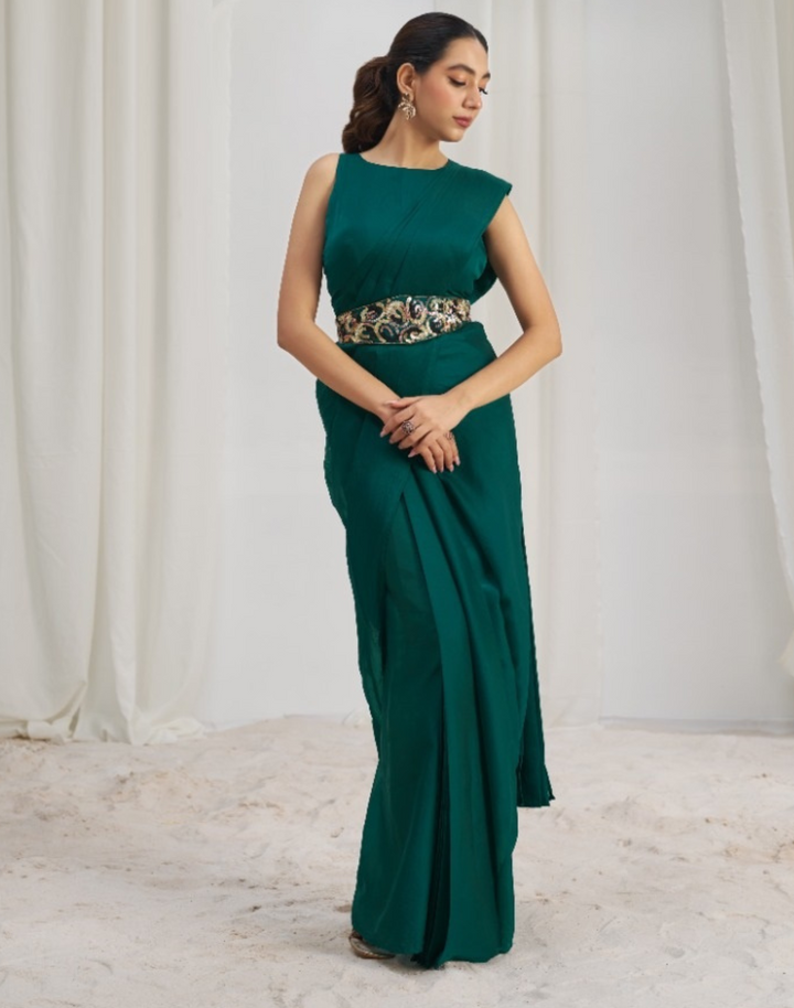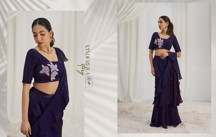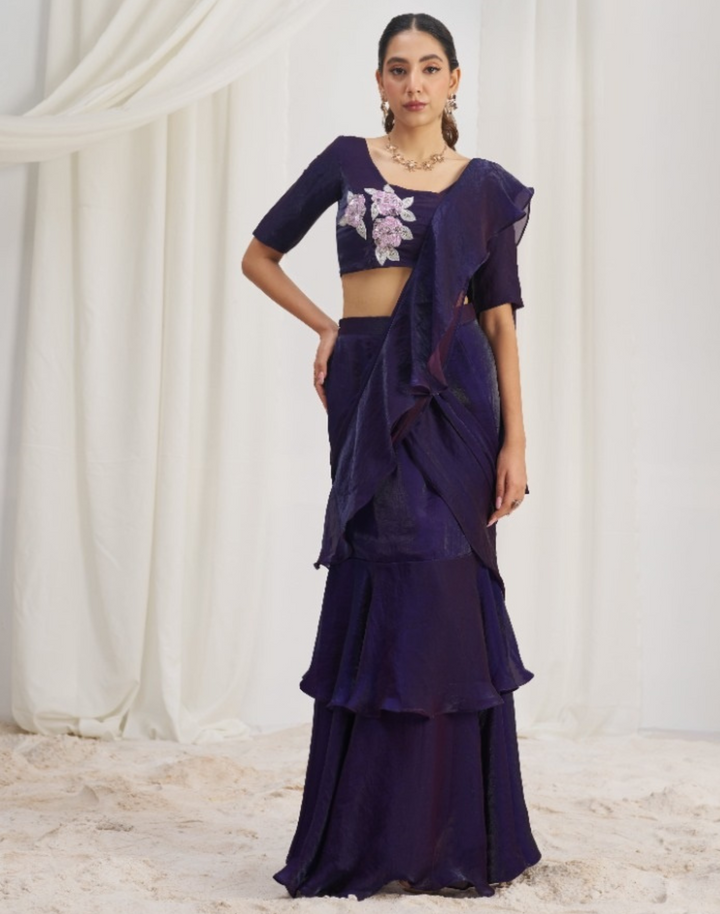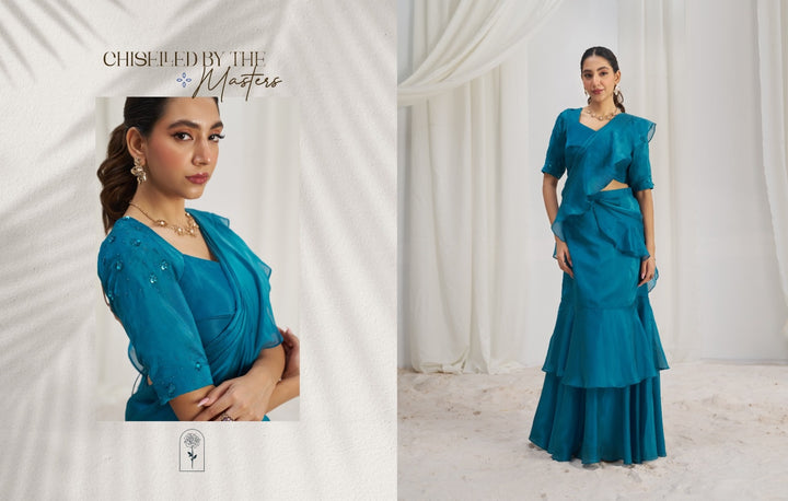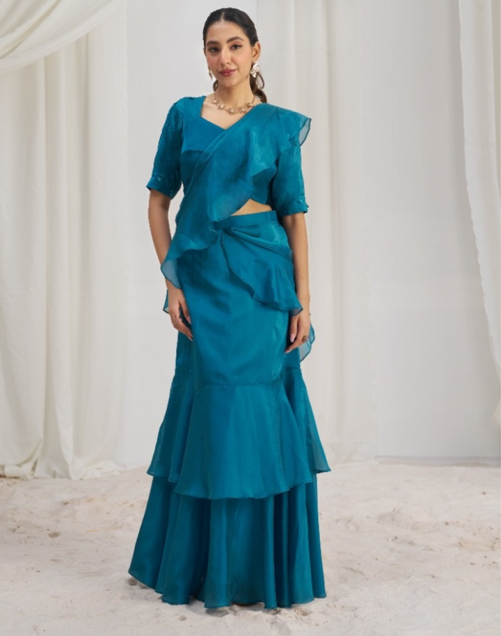 FABRIC: SAREE : Organza with belt | BLOUSE: Organza | WORK: Embellished Handwork withPrinted,Ruffle ,Waist Belt