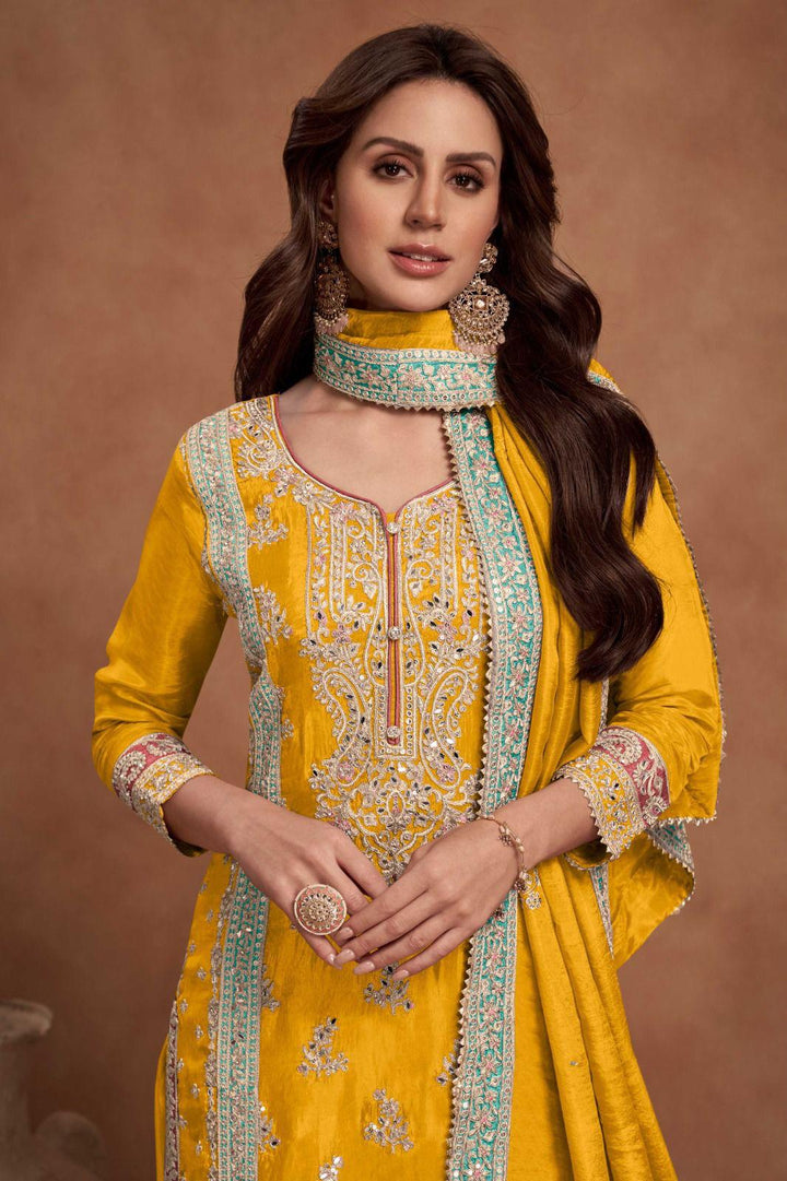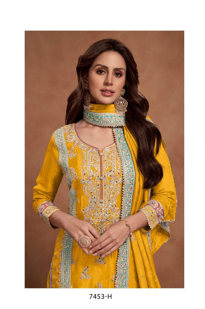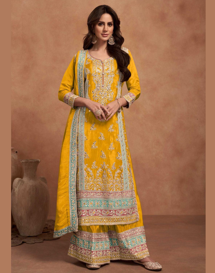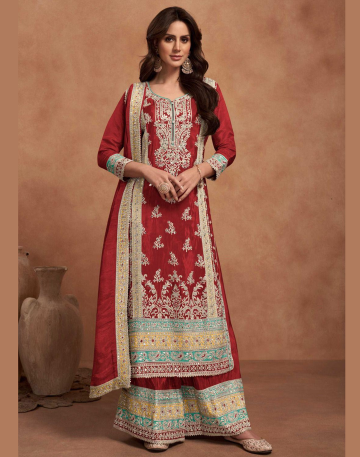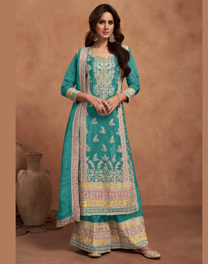 The Real Simar Silk Embroidered Sequins Palazzo Suit is an exquisite blend of elegance and sophistication perfect for making a graceful statement at any celebration. The fabric is crafted from luxurious Viscose Silk known for its soft texture and subtle sheen adding a touch of glamour to the ensemble. The entire suit is adorned with intricate sequins embroidery giving it a radiant sparkle that catches the light beautifully.