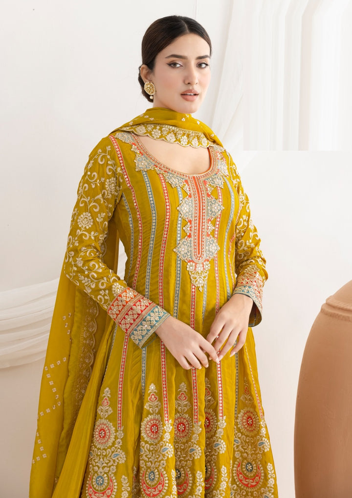 Stepnshop presents a stunning Anarkali-style suit set crafted in rich Silk fabric, offering a luxurious drape and elegant flare. The kameez features exquisite Dabka Dori, Resham embroidery, and Mirror handwork, adding a touch of regal charm and festive shine. Paired with matching Silk pants and a Silk dupatta, this ensemble is perfect for weddings, celebrations, and grand occasions. Designed for those who love timeless beauty with detailed craftsmanship, this Anarkali brings grace to every step you take.