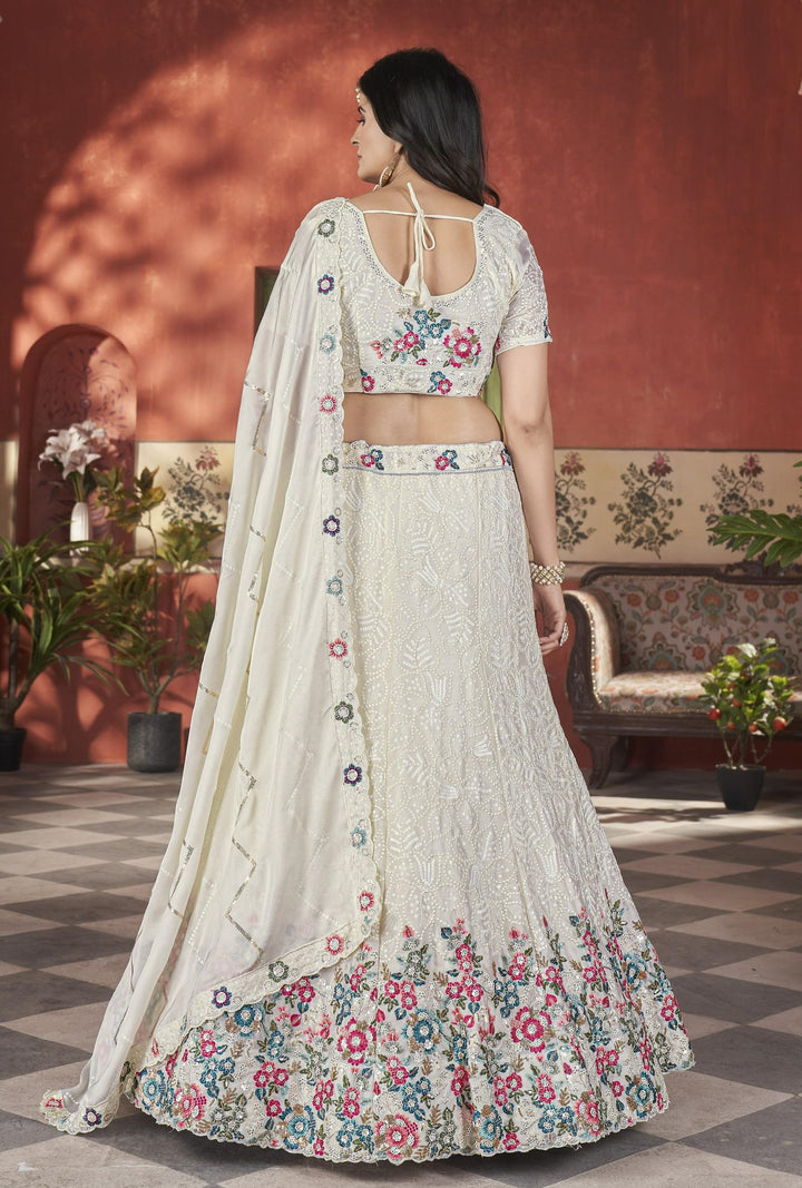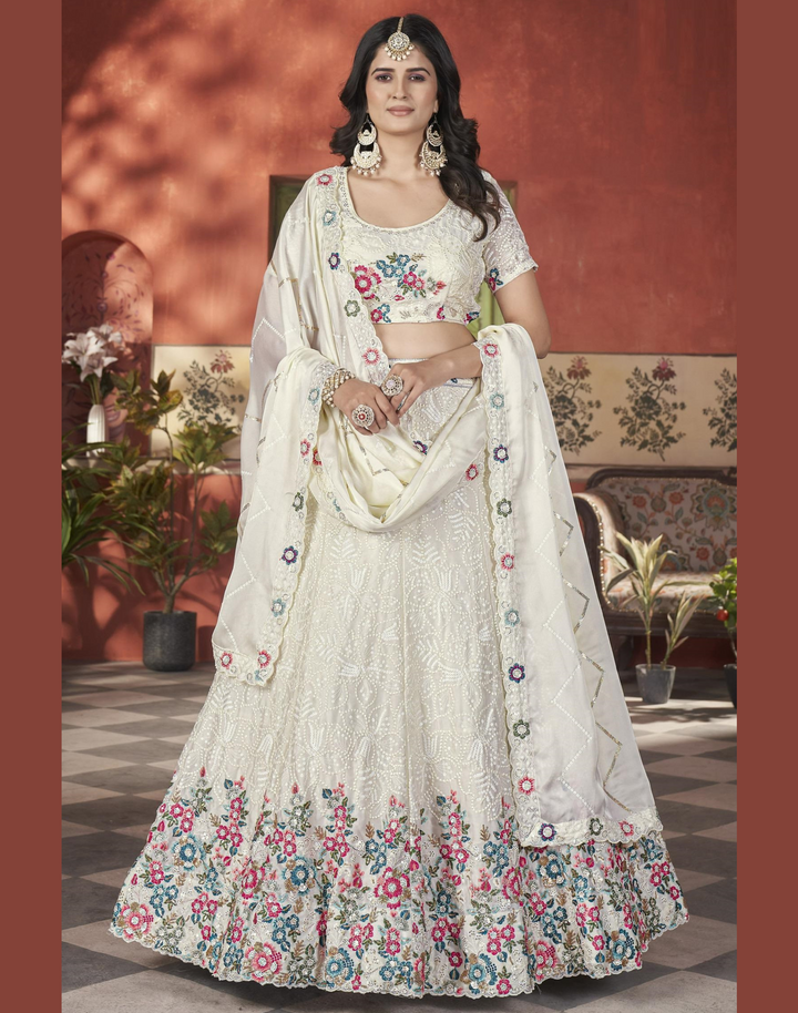 “Discover the stunning Sangeet White Art Silk Designer Lehenga, perfect for Indian weddings. This elegant bridal lehenga features intricate embroidery and vibrant hues, making it a must-have for your special day. Shop now for bridal fashion!”