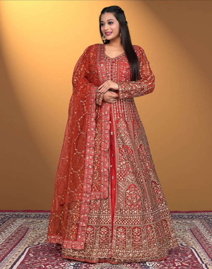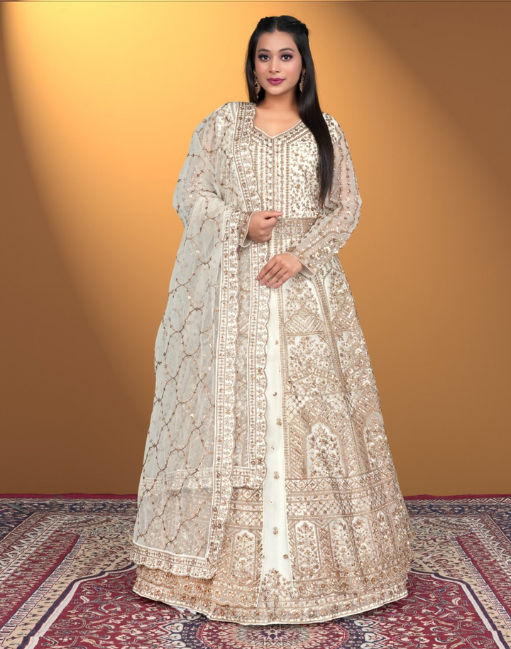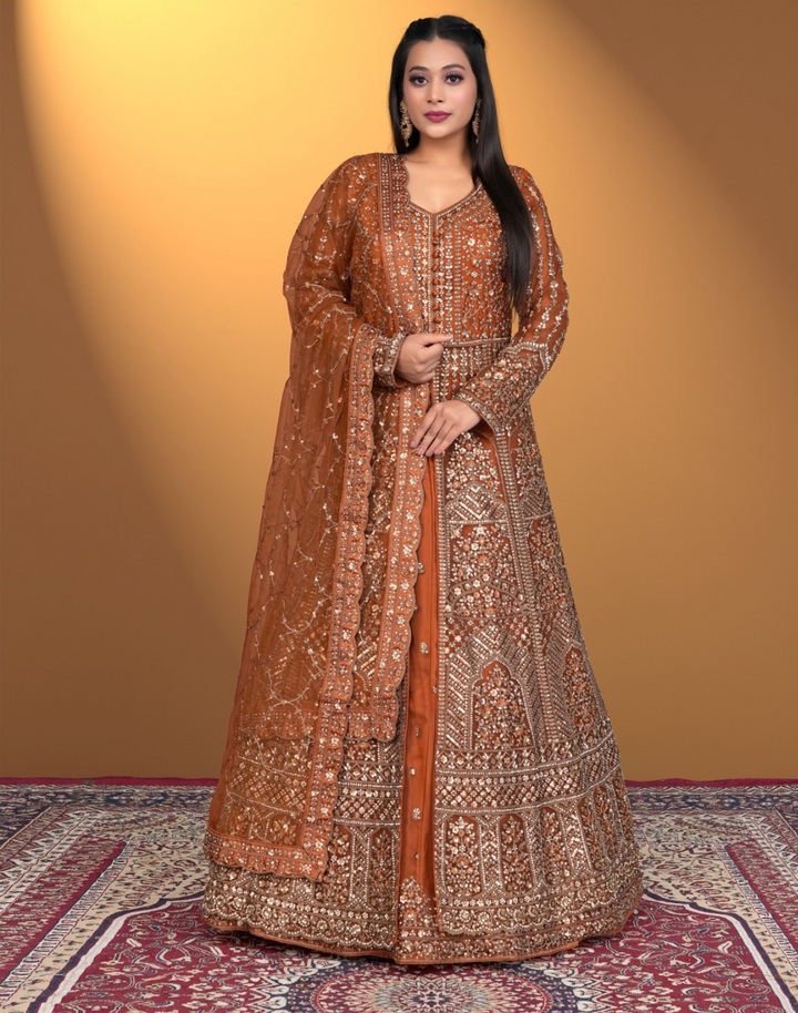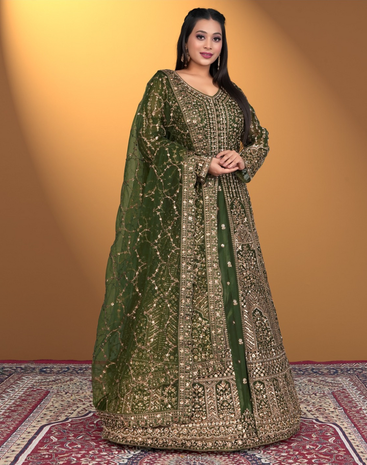 Say hello to your new ethnic outfit, the Pure Green Net crafted attire with a flattering silhouette will be your go-to style this festive season. Exquisitely embroidered with traditional design, this Pure Purple georgette anarkali suit which will reflect the charm of high-end fashion. The dreamy attire is crafted to perfection and features delicate and minimal zari embroidery all over it along with a beautiful empire belt. The full-sleeved beauty is paired with an equally charming embellished net dupatta . Style this pretty attire on any wedding or Diwali festival party with heels and jewelry to look stunningly beautiful from the rest of the crowd.