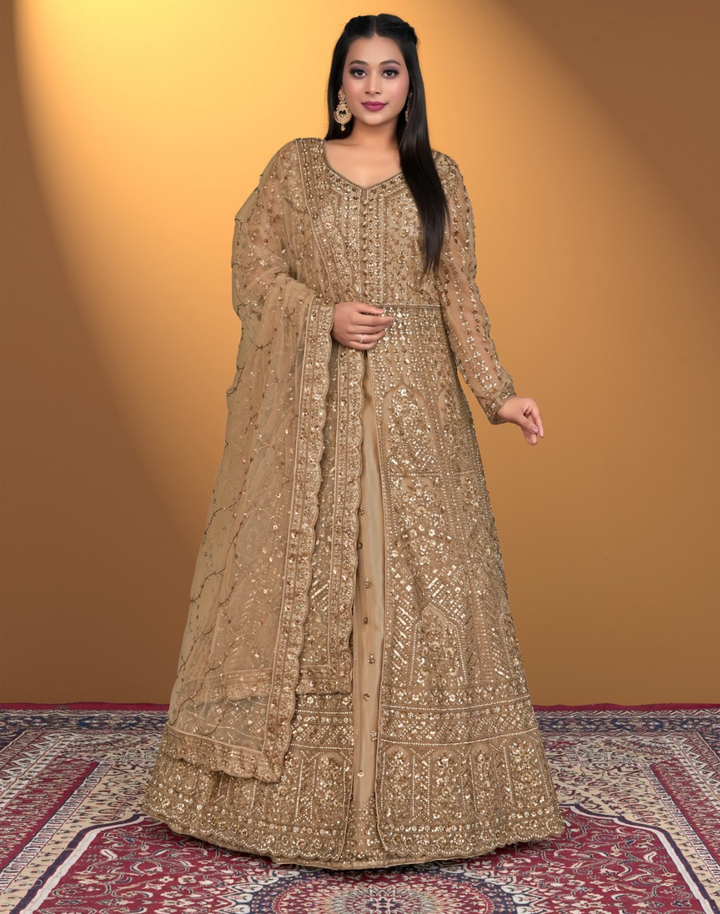 Net Muslim Zarkan Sequence Front Slit Gown for Wedding