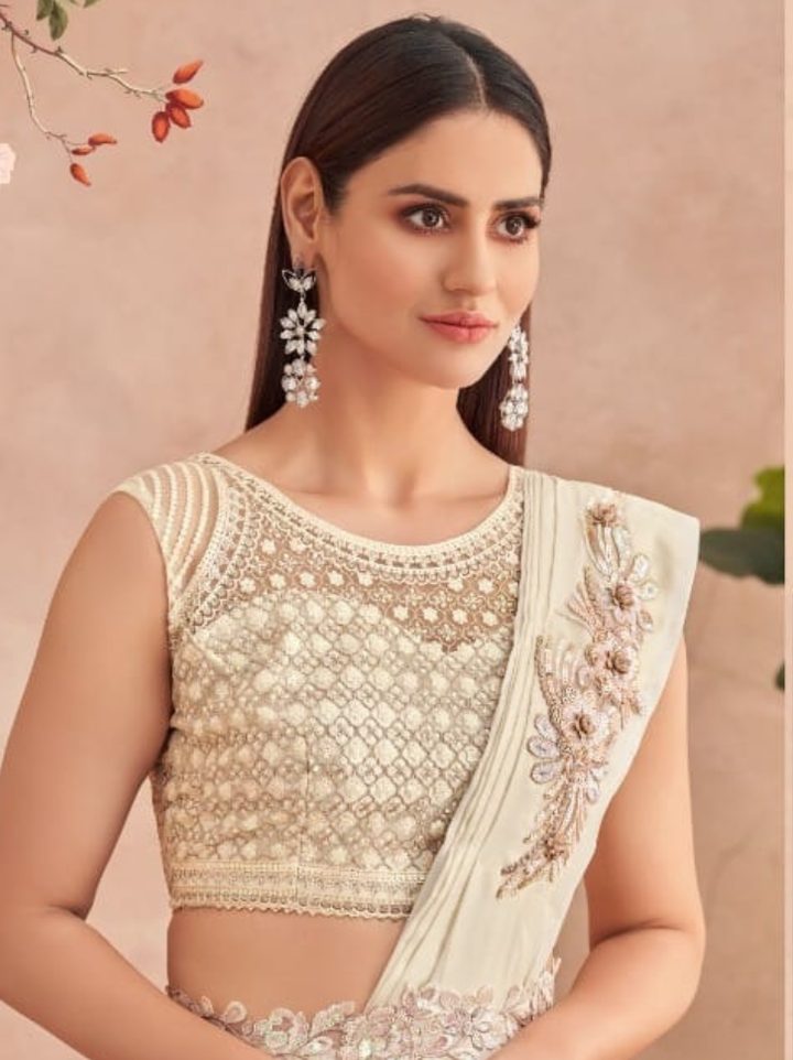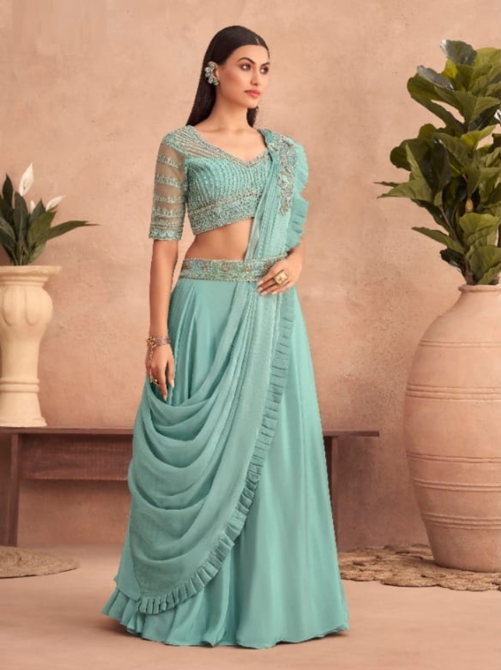 Floral Applique Pre-Stitched Lehenga Style Saree with Ruffled