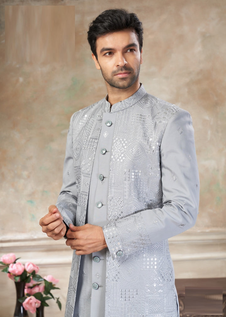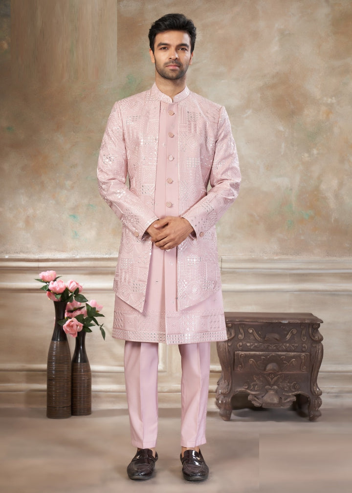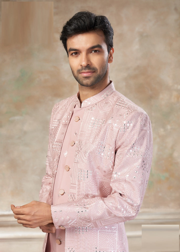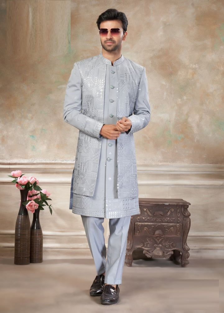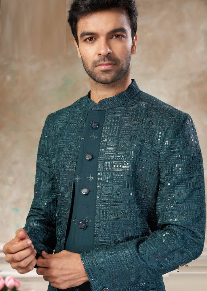 Stepnshop presents this stylish men’s wear set, crafted from premium viscose fabric for a soft and comfortable feel. The ensemble includes a finely tailored kurta, matching bottom, and a coordinating jacket, all enhanced with elegant embroidery and sequence work. Perfect for weddings, festive events, or cultural occasions, this outfit exudes sophistication and traditional charm with a modern edge.
