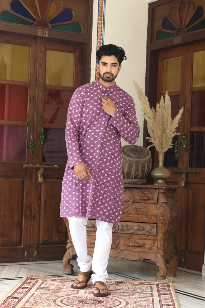 This men’s wear set features a comfortable cotton kurta paired with a stylish fancy pajama. Designed with elegant print work, it blends traditional charm with a modern touch. Perfect for festive occasions, family gatherings, or casual celebrations, this outfit offers both comfort and sophistication in one refined look.