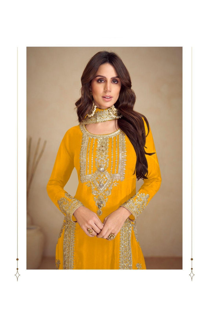 Embrace elegance with this stunning Chinon suit set, featuring a beautifully designed kameez, pant, and dupatta, all crafted from rich chinon fabric. The ensemble is enhanced with exquisite embroidery work, adding timeless grace and sophistication. Perfect for festive celebrations, weddings, and special occasions, this outfit blends traditional artistry with modern charm, making it a must-have for your ethnic collection.