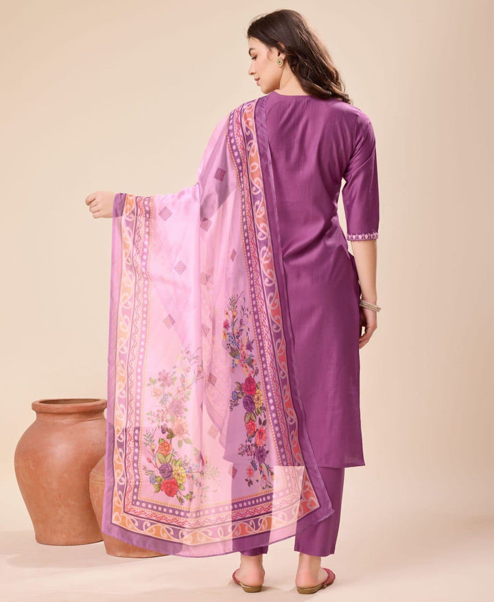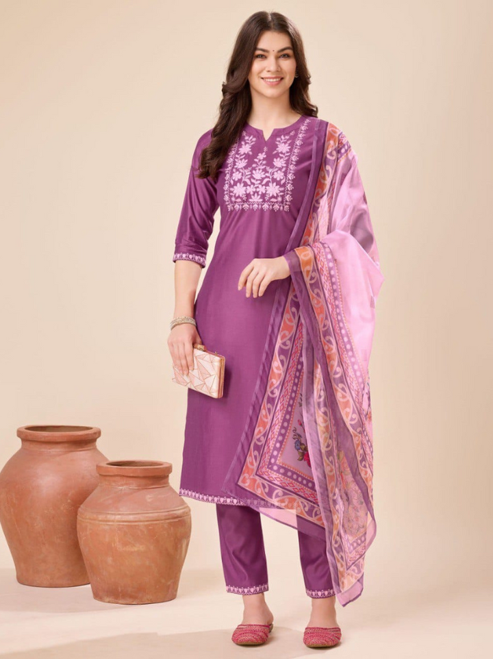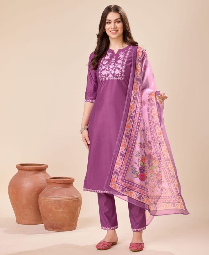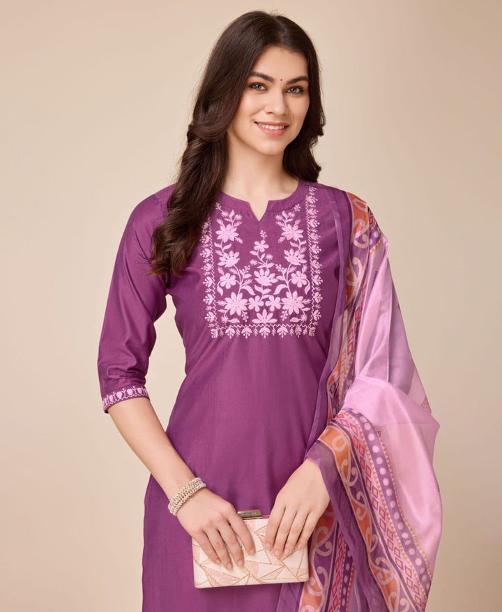 Viscose Suit Set with Floral Thread Embroidery & Organza Dupatta