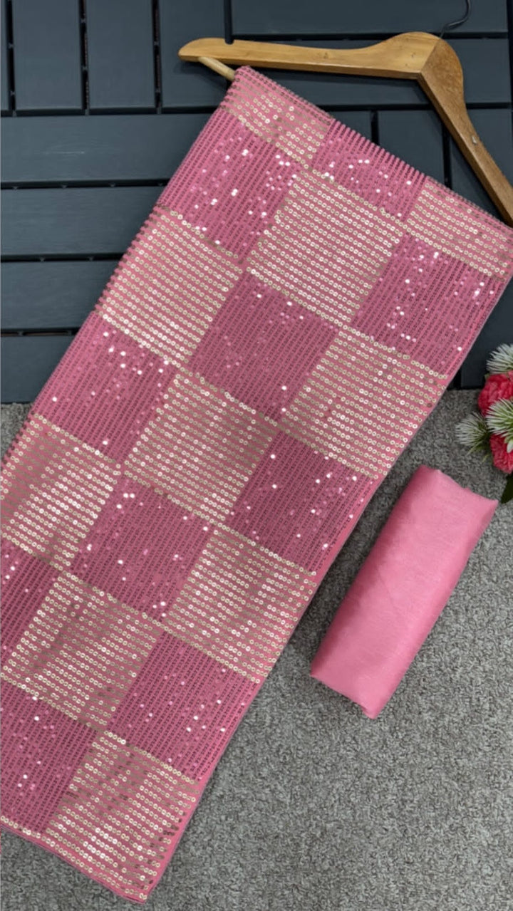 Exquisite color embroidered sari with blouse, a true masterpiece for any occasion. Crafted with utmost precision, this baby pink designer sequin styled georgette saree is adorned with intricate thread work, adding a touch of elegance and sophistication. Perfectly blending traditional and contemporary elements, this saree is a must-have for every fashion-forward woman. Whether it’s a wedding, party, or any special event, this sari will make you the center of attention with its stunning design and vibrant pink hue. Get ready to dazzle and make a lasting impression with this exceptional piece of art.