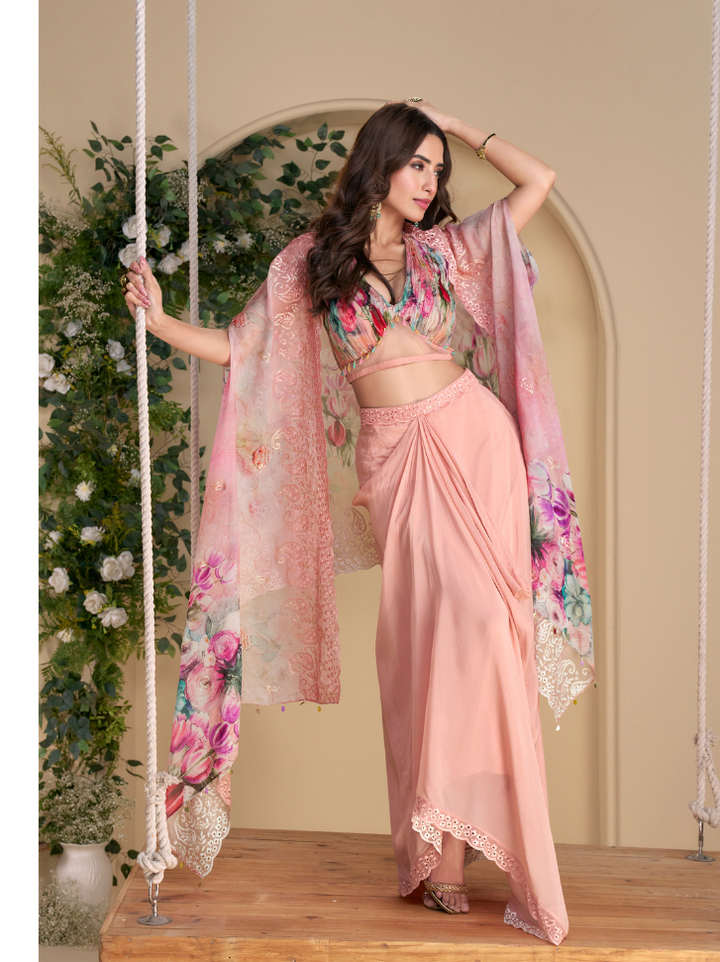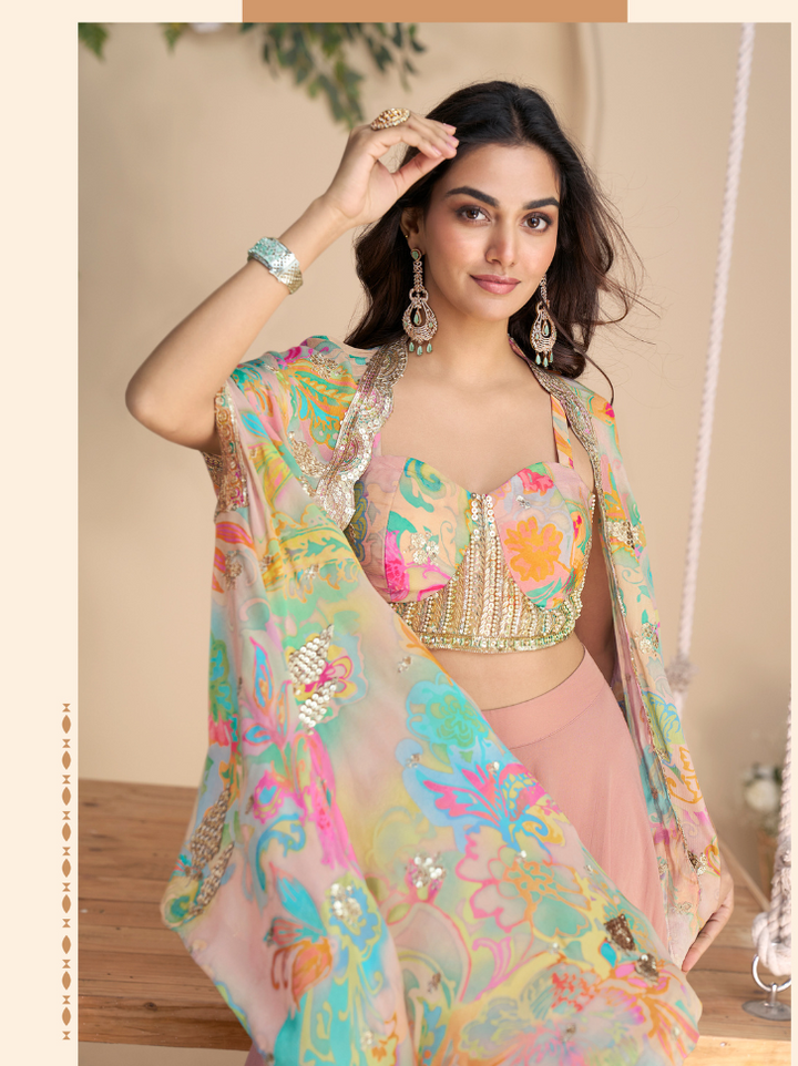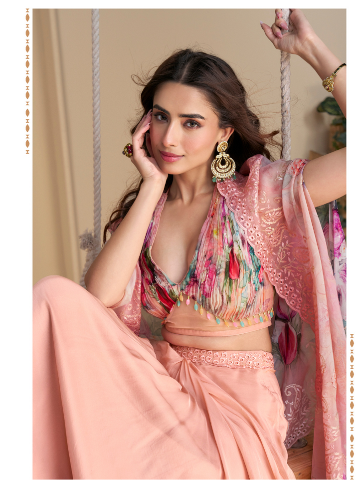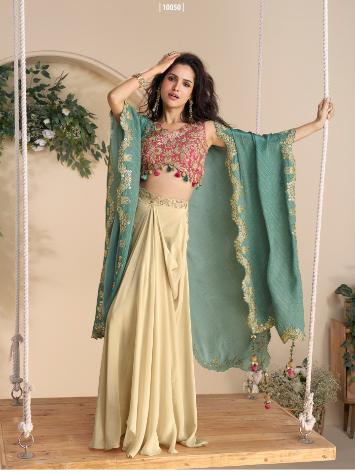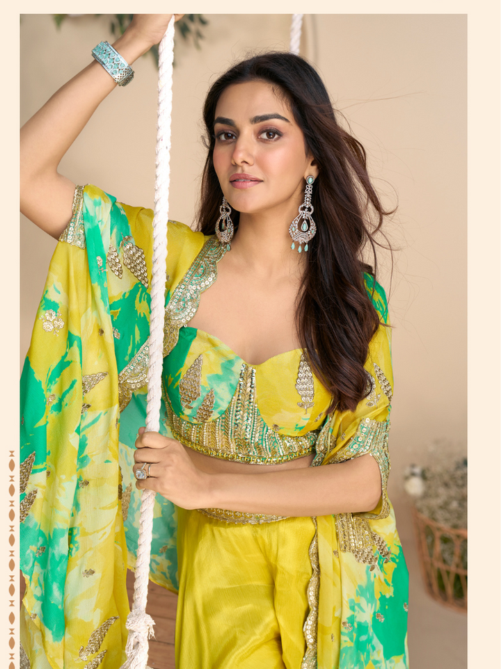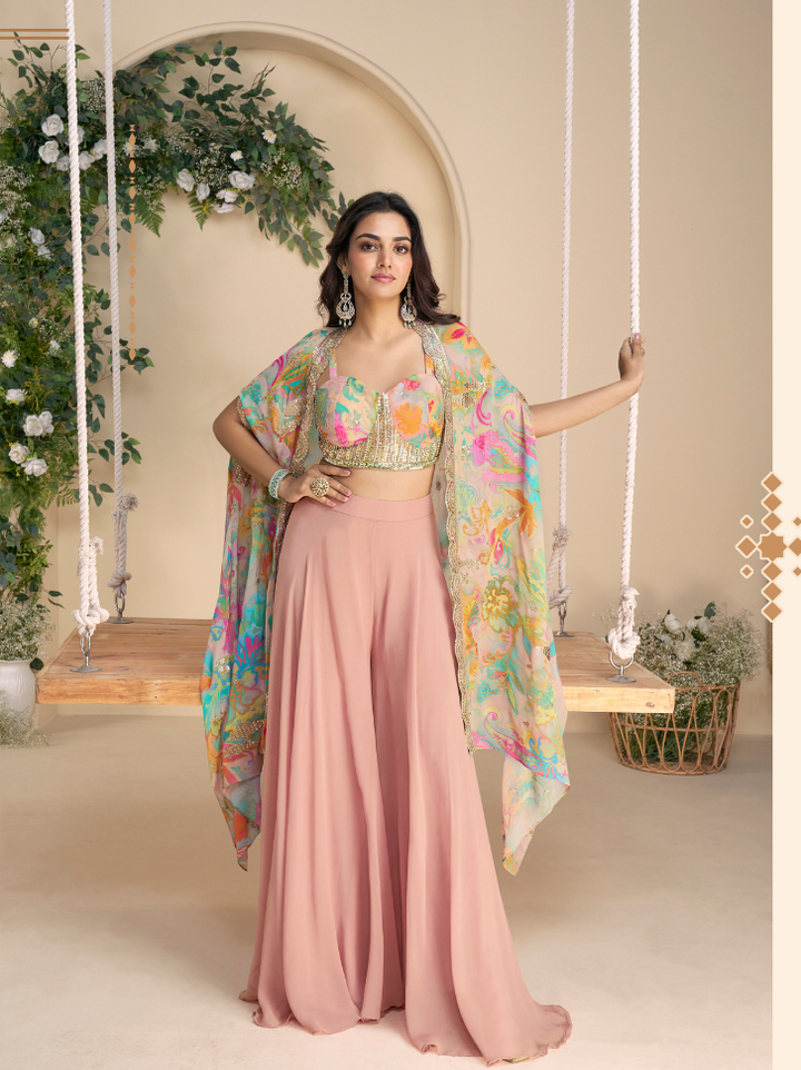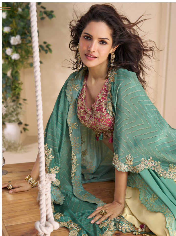 Step into elegance with this three-piece ensemble crafted from luxurious Chinon silk. The set includes a beautifully tailored top, matching bottom, and a stylish jacket — all in soft, flowy fabric. The top features delicate embroidery, adding a touch of sophistication. Perfect for festive gatherings, parties, or special occasions.
