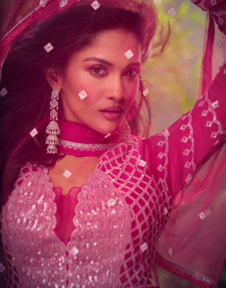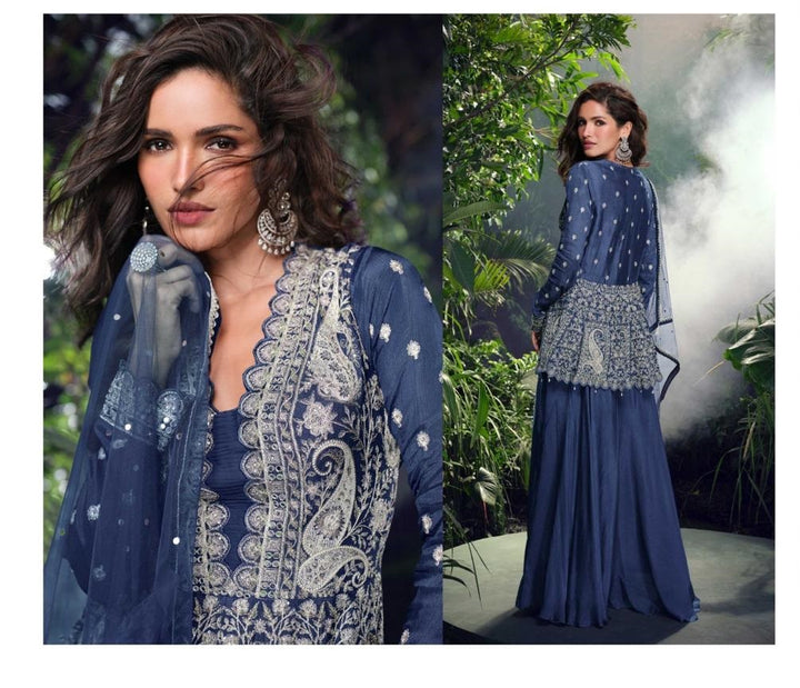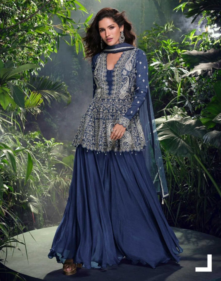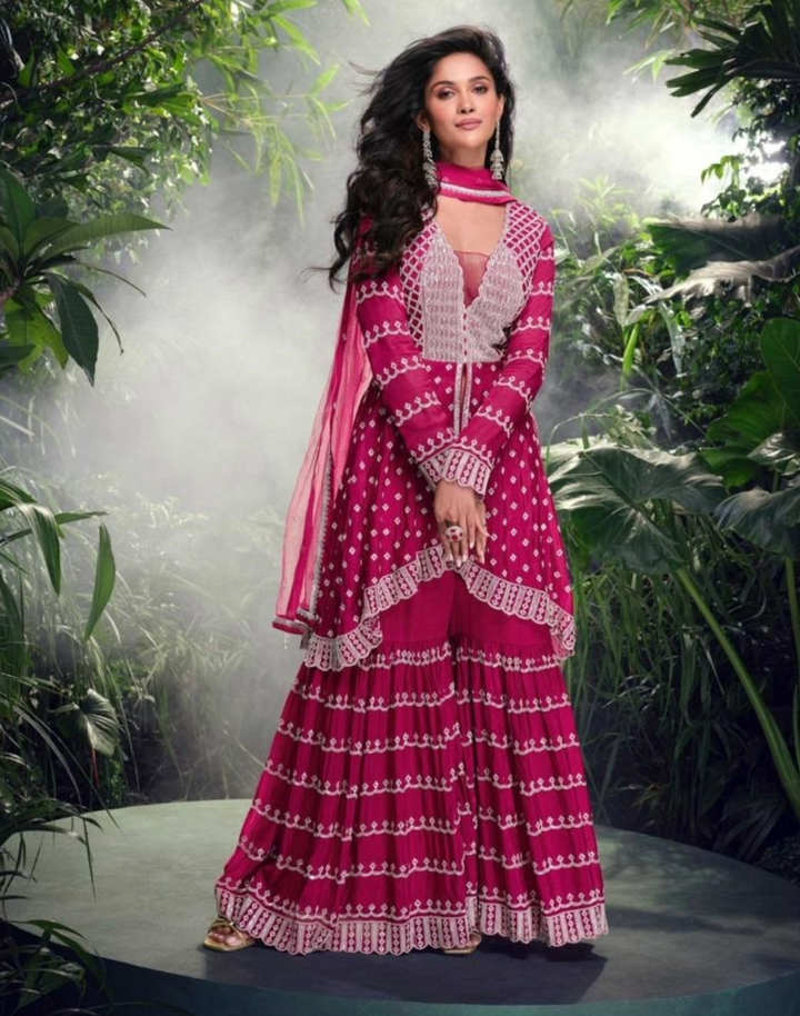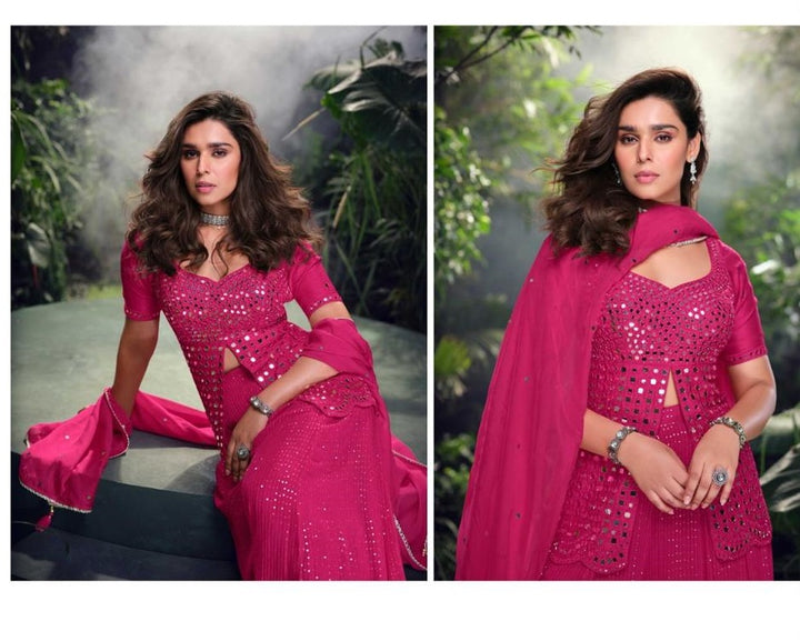 Drape yourself in elegance with this magenta sharara suit, a stunning piece that combines tradition with a modern flair. Designed from premium Real Chinon Silk, this suit showcases intricate hand mirror embroidery, making it the perfect choice for weddings, festivals, and celebrations.