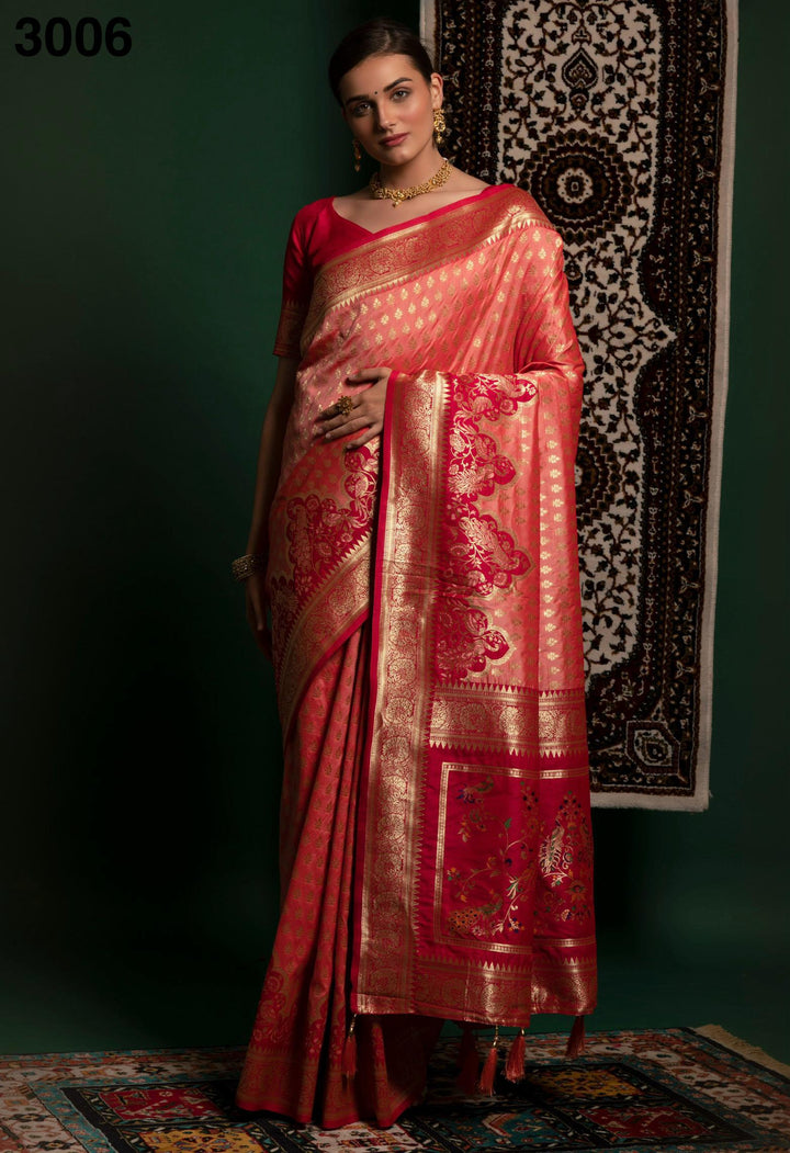 The rich Banarasi Kanjivaram fabric perfectly complements the luminous rose gold hue, offering a harmonious blend of tradition and modernity. Paired with a maroon fancy fabric blouse featuring heavy embroidery, this saree ensures you look flawless for weddings, festivals, or grand celebrations. #BanarasiFencyWeddingSareeInKanjivaramSilk, #KanjivaramSilkSareesForWedding, #HandwovenBanarasiSarees, #BridalSareesOnline, #StunningBanarasiSaree