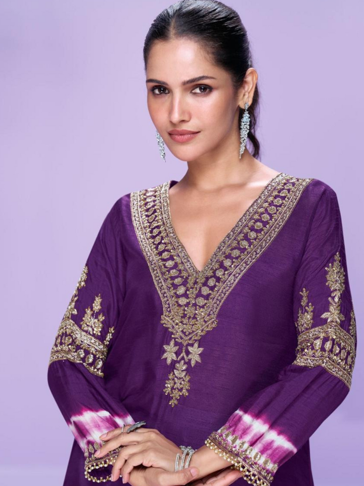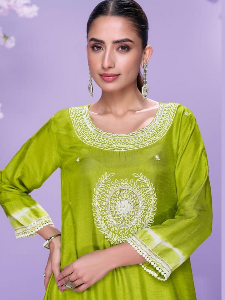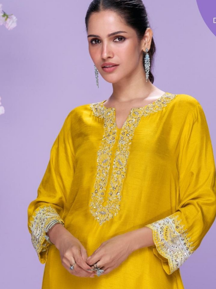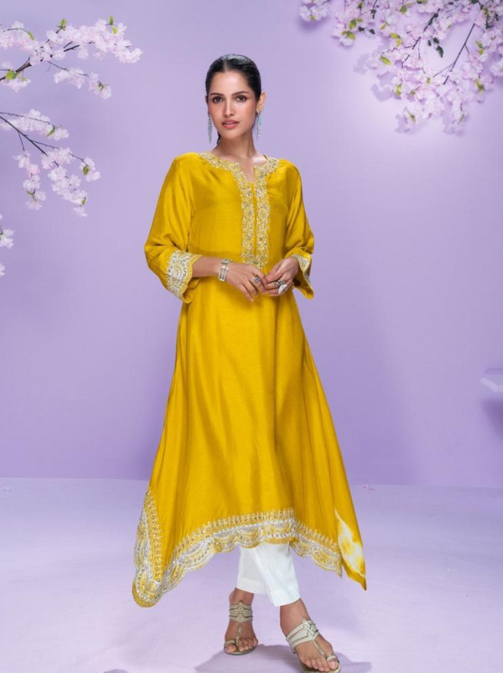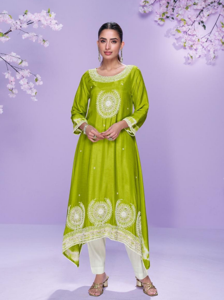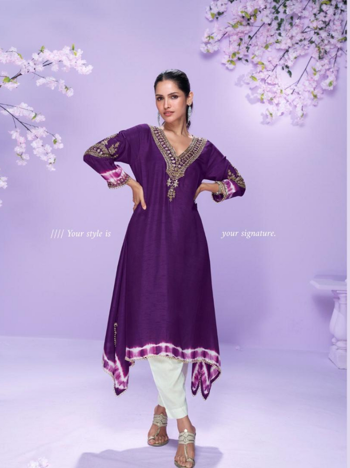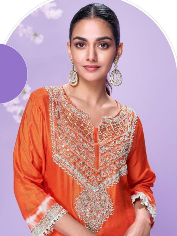 Exude effortless elegance with this beautifully crafted kurti-style outfit in luxurious silk fabric. Paired with matching bottoms, the ensemble is adorned with delicate embroidery work that adds a graceful charm. Perfect for festive occasions, casual gatherings, or elegant day wear, this kurti set blends simplicity with sophistication.
