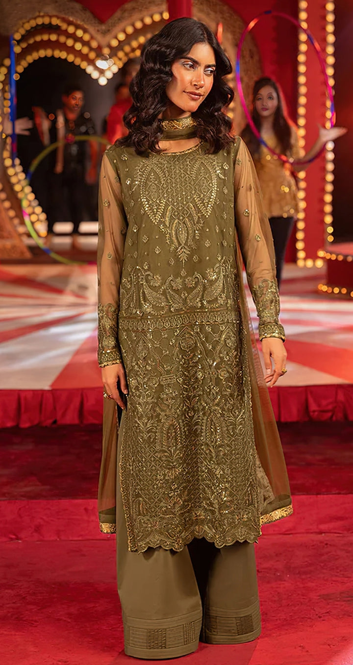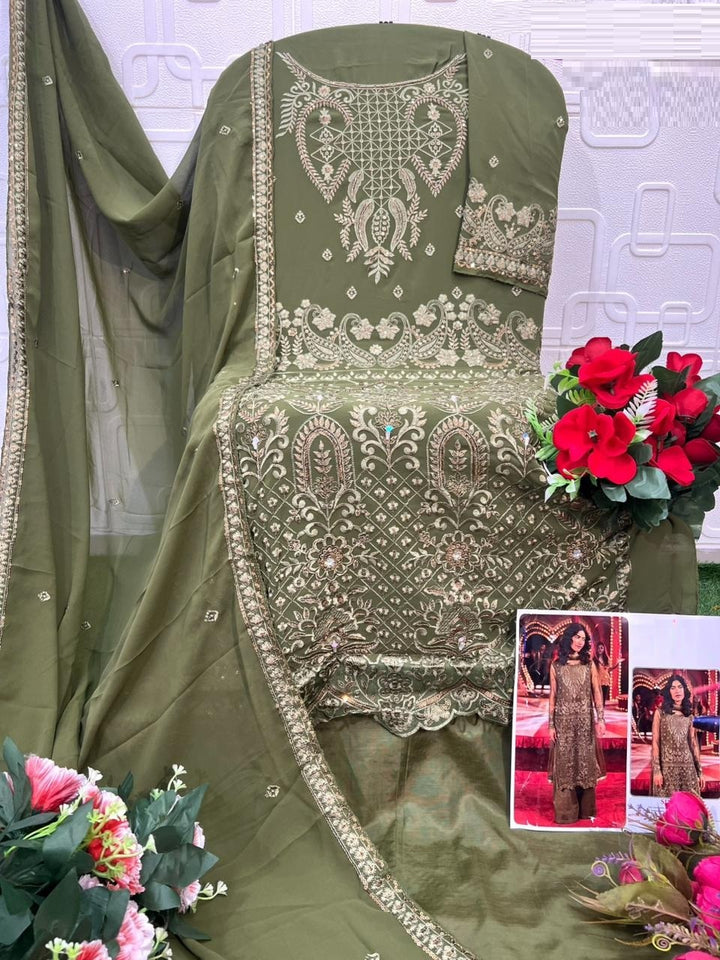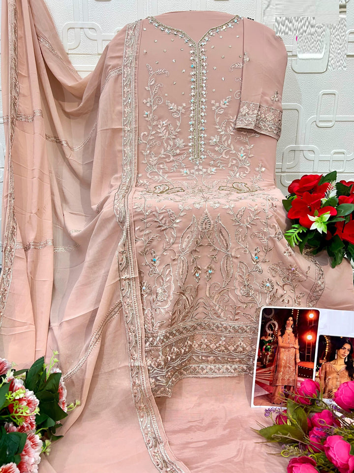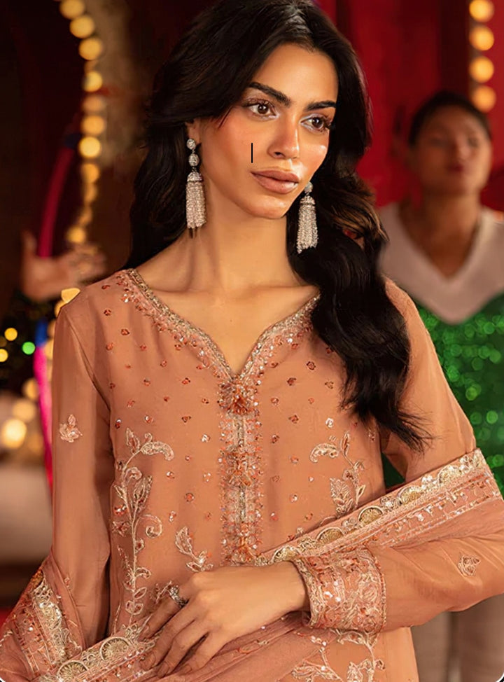 Presenting an elegant Pakistani-style ensemble crafted for timeless festive charm. The Georgette kameez features beautifully detailed embroidery work, paired with a comfortable Santoon pant for a sleek and graceful silhouette. The matching Georgette dupatta adds a touch of sophistication with its soft fall and refined finish. Perfect for celebrations, functions, and traditional gatherings, this outfit blends classic Pakistani aesthetics with modern finesse.