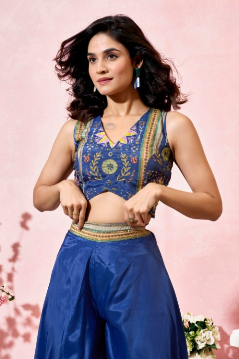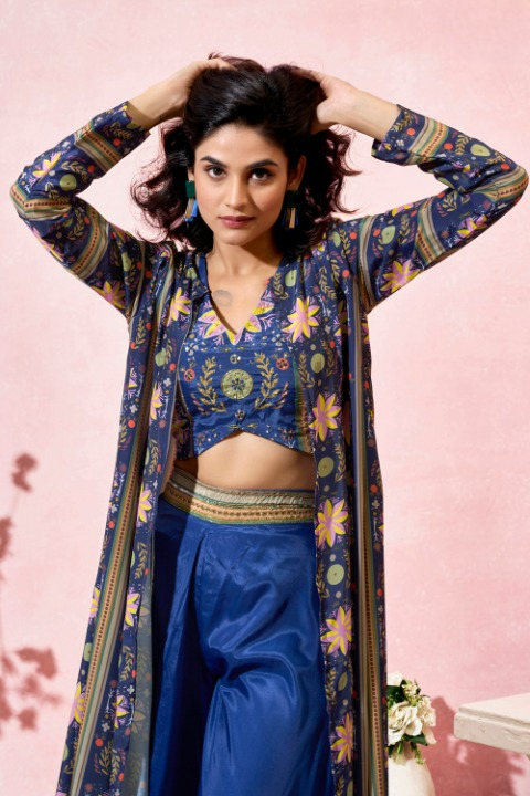 Women's Crepe Co-ord Set with Hand Work – Crop Top, Palazzo & Shrug