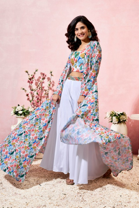 Step into effortless style with this chic 3-piece co-ord set featuring a crop top, palazzo, and shrug — all crafted from premium crepe fabric for a graceful drape and comfortable fit. The highlight of this ensemble is the exquisite hand work detailing, adding a touch of artisanal charm to its contemporary silhouette. Whether you're heading to a festive brunch, a mehendi event, or a stylish evening gathering, this outfit strikes the perfect balance between ethnic elegance and modern flair.